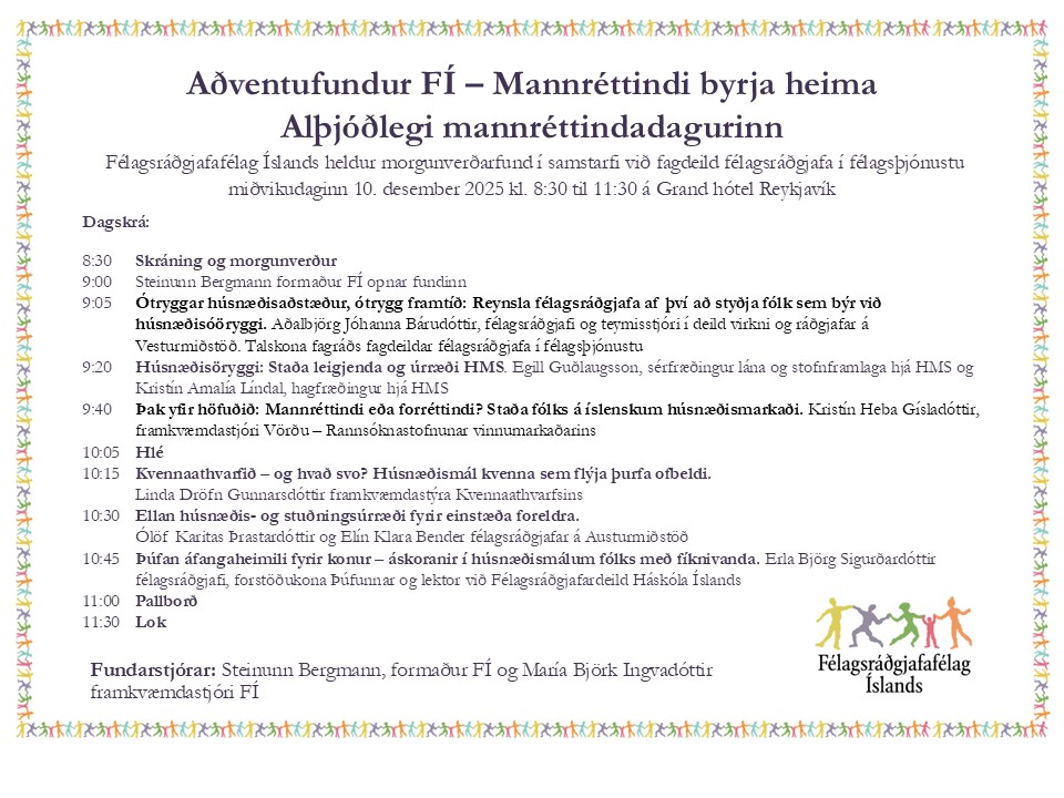 Árlegur aðventufundur Félagsráðgjafafélags Íslands nú í samstarfi við fagdeild félagsráðgjafa í félagsþjónustu, verður haldinn á Grand Hótel Reykjavík, miðvikudaginn 10.desember, frá kl. 8.30-11.30. Yfirskrift fundarins í ár er ; mannréttindi…