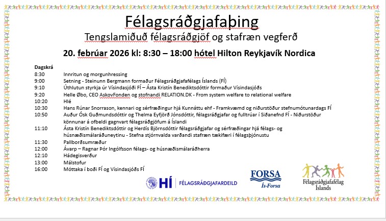 Okkar árlega Félagsráðgjafaþing verður haldið föstudaginn 20. febrúar 2026 á Hilton Reykjavík Nordica og er þema þingsins í ár "Tengslamiðuð félagsráðgjöf og stafræn vegferð". Aðalfyrirlesari er Helle Øbo, forstjóri AskovFonden, stofnunar…