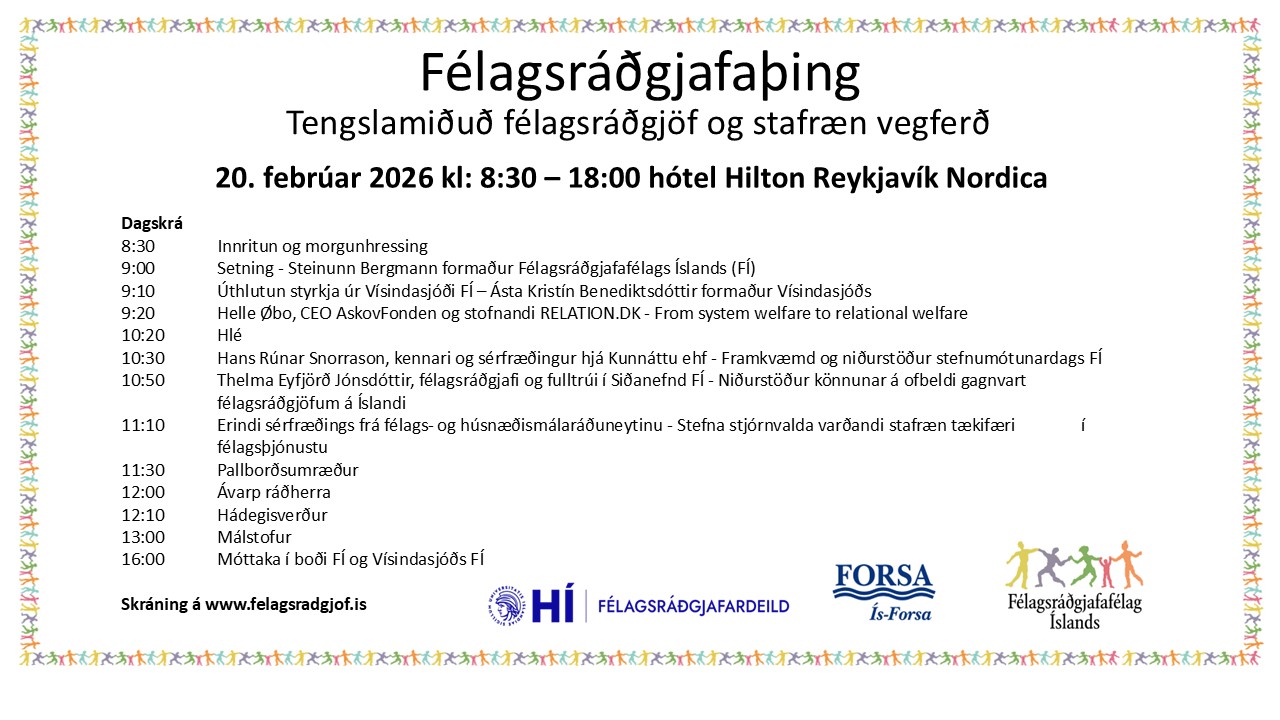 Okkar árlega Félagsráðgjafaþing verður haldið föstudaginn 20. febrúar 2026 á Hilton Reykjavík Nordica og er þema þingsins í ár "Tengslamiðuð félagsráðgjöf og stafræn vegferð". Aðalfyrirlesari er Helle Øbo, forstjóri AskovFonden, stofnunar…